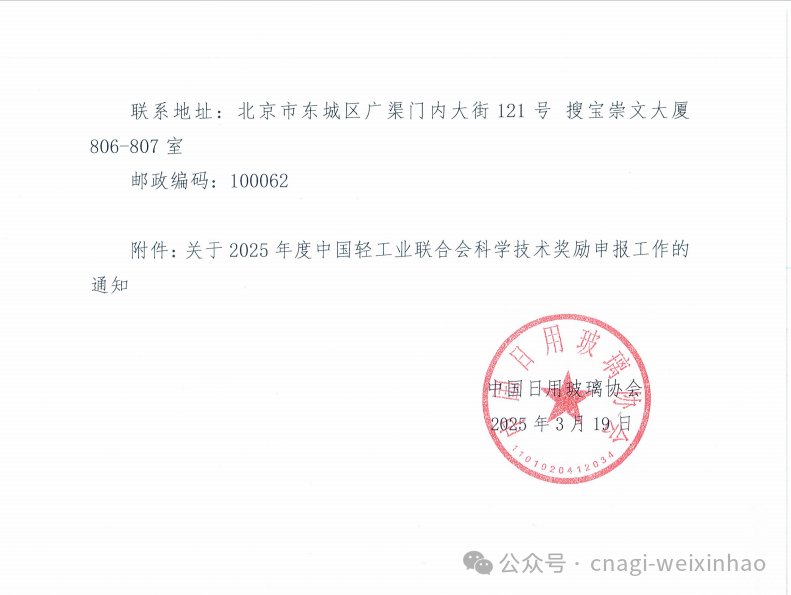 根据《中国轻工业联合会科学技术奖励办法》、《中国轻工业联合会科学技术奖励办法实施细则》,中国轻工业联合会(以下简称:中国轻工联)日前发出“关于2025年度中国轻工业联合会科学技术奖励申报工作的通知”(中轻联综合[2025]42号),部署2025年度中国轻工联科学技术奖励申报工作。受中国轻工联的委托,中国日用玻璃协会受理日用玻璃行业中国轻工联科技奖申报材料,负责申报项目资料的形式审查,并汇总报送奖励办公室。科技奖励申报工作通知、申报书及填写说明等有关信息可从“中国轻工业联合会”官网(http://www.cnlic.org.cn/)下载。请各申报单位认真阅读有关文件资料,严格按照中国轻工联科技奖励工作的有关规定和申报要求及申报书填写说明,填写和报送申报材料。请各申报单位于2025年6月5日前,将申报材料的书面版和电子版报送中国日用玻璃协会,逾期不予受理。联系电话:010-65248399 手机(微信) 13716270432联系地址:北京市东城区广渠门内大街121号 搜宝崇文大厦806-807室