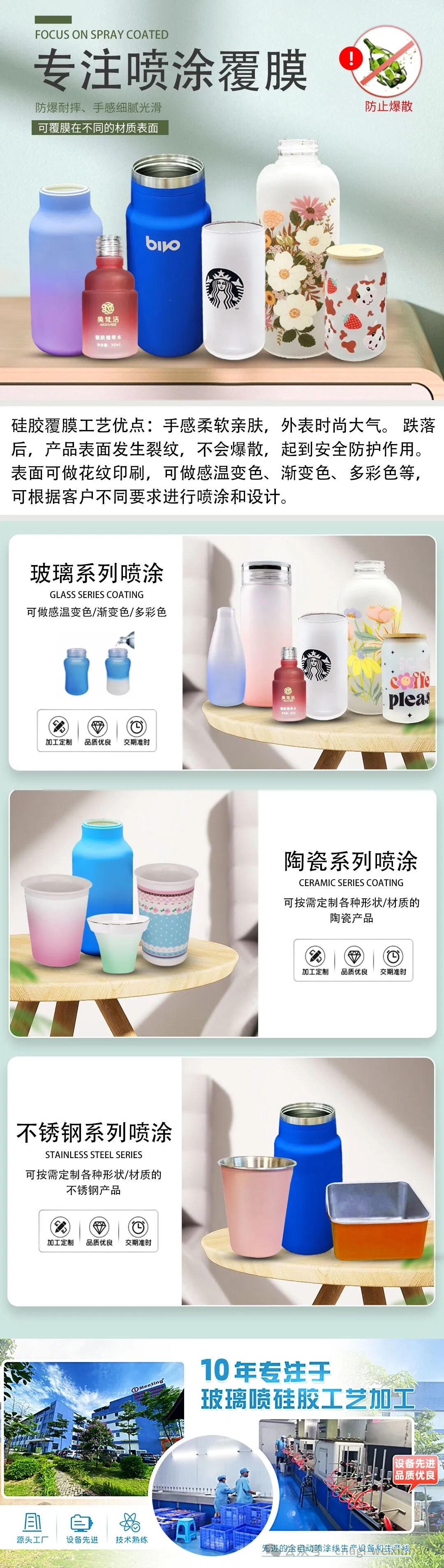 硅胶覆膜工艺优点,手感舒适, 犹如手触宝宝的皮肤感,产品安全防爆, 跌落后,不会爆散,起到安全防护作用,产品外观高端大气,表面可做花纹印刷, 可做感温变色、渐变色、多彩色硅胶覆膜工艺, 根据客户要求采用不同厚度手感设计。研发优势 公司拥有独立的研发团队,并掌握先进技术和产品工艺,不断推出新材料、材质的产品应用。生产优势 公司拥有拥有5000平方宽敞明亮的标准化无尘车间,生产线和一流的全自动喷涂线生产设备,保证产品质量,月产能达到100万支。品质优势 独立的品质管控部门,完善的质量保证管理体系,确保产品品质膜厚测试、附着力百格测试、耐磨性测试、剥离测试耐溶剂测试、蒸煮耐温测试、表面抗污测试,洗碗机测试等。成本优势 价格成本可控,原材料源头直接生产加工,不经其他中间环节,节省生产成本。主营产品:1.玻璃制品喷硅胶加工 2、不锈钢五金系列制品喷硅胶加工 3、塑料制品喷硅胶加工 4、陶瓷制品喷硅胶加工。公司地址:广州市花都区花东镇金谷工业区启东路4号C栋3楼联系电话:19864893319,13066319033;