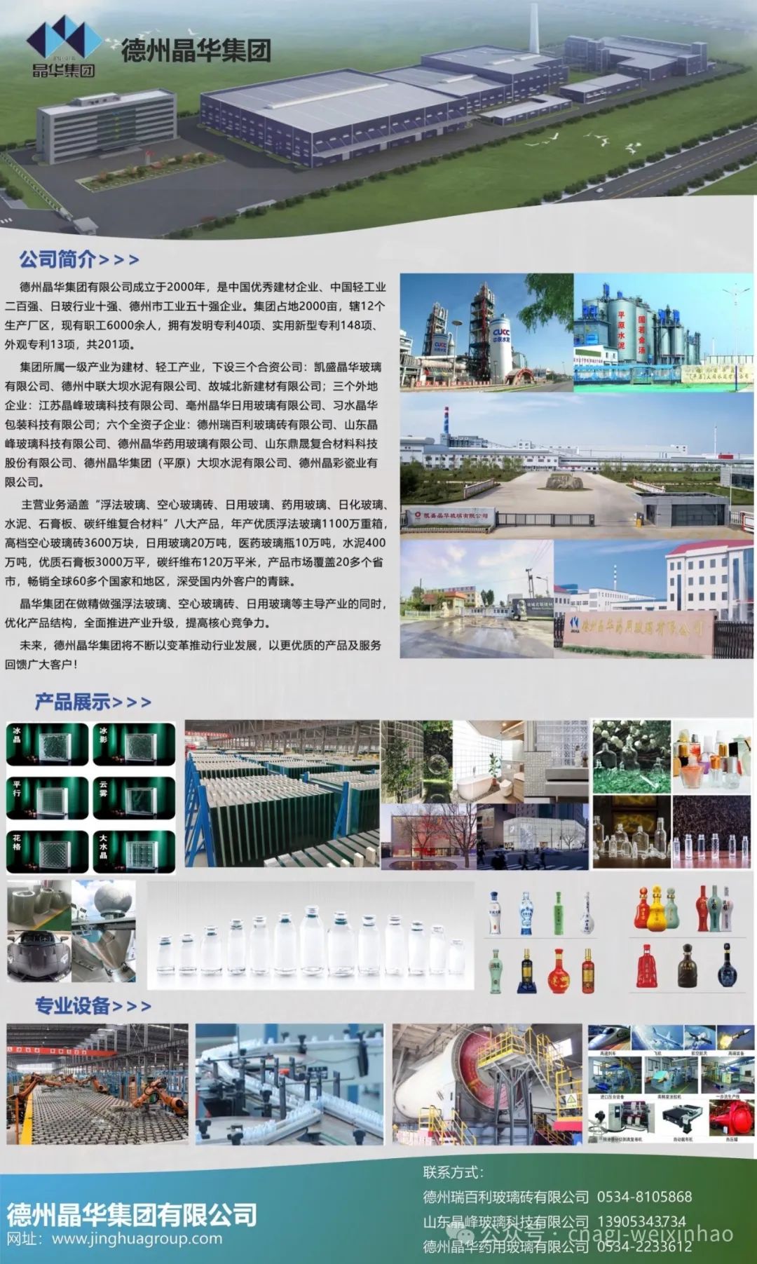 德州晶华集团有限公司成立于2000年,是中国优秀建材企业、中国轻工业二百强、日玻行业十强、德州市工业五十强企业。集团占地2000亩,辖12个生产厂区,现有职工6000余人,拥有发明专利40项、实用新型专利148项、外观专利13项,共201项。集团所属一级产业为建材、轻工产业,下设三个合资公司:凯盛晶华玻璃有限公司、德州中联大坝水泥有限公司、故城北新建材有限公司;三个外地企业:江苏晶峰玻璃科技有限公司、亳州晶华日用玻璃有限公司、习水晶华包装科技有限公司;六个全资子企业:德州瑞百利玻璃砖有限公司、山东晶峰玻璃科技有限公司、山东鼎晟复合材料科技股份有限公司、德州晶华集团(平原)大坝水泥有限公司、德州晶彩瓷业有限公司等六家子公司。。主营业务涵盖“浮法玻璃、空心玻璃砖、日用玻璃、药用玻璃、日化玻璃、水泥、石膏板、碳纤维复合材料”八大产品,年产优质浮法玻璃1100万重箱,高档空心玻璃砖3600万块,日用玻璃20万吨,医药玻璃瓶10万吨,水泥400万吨,优质石膏板3000万平,碳纤维布120万平米,产品市场覆盖20多个省市,畅销全球60多个国家和地区,深受国内外客户的青睐。晶华集团在做精做强浮法玻璃、空心玻璃砖、日用玻璃等主导产业的同时,优化产品结构,全面推进产业升级,提高核心竞争力。未来,德州晶华集团将不断以变革推动行业发展,以更优质的产品及服务回馈广大客户!德州瑞百利玻璃砖有限公司 0534-8105868德州晶华药用玻璃有限公司 0534-2233612