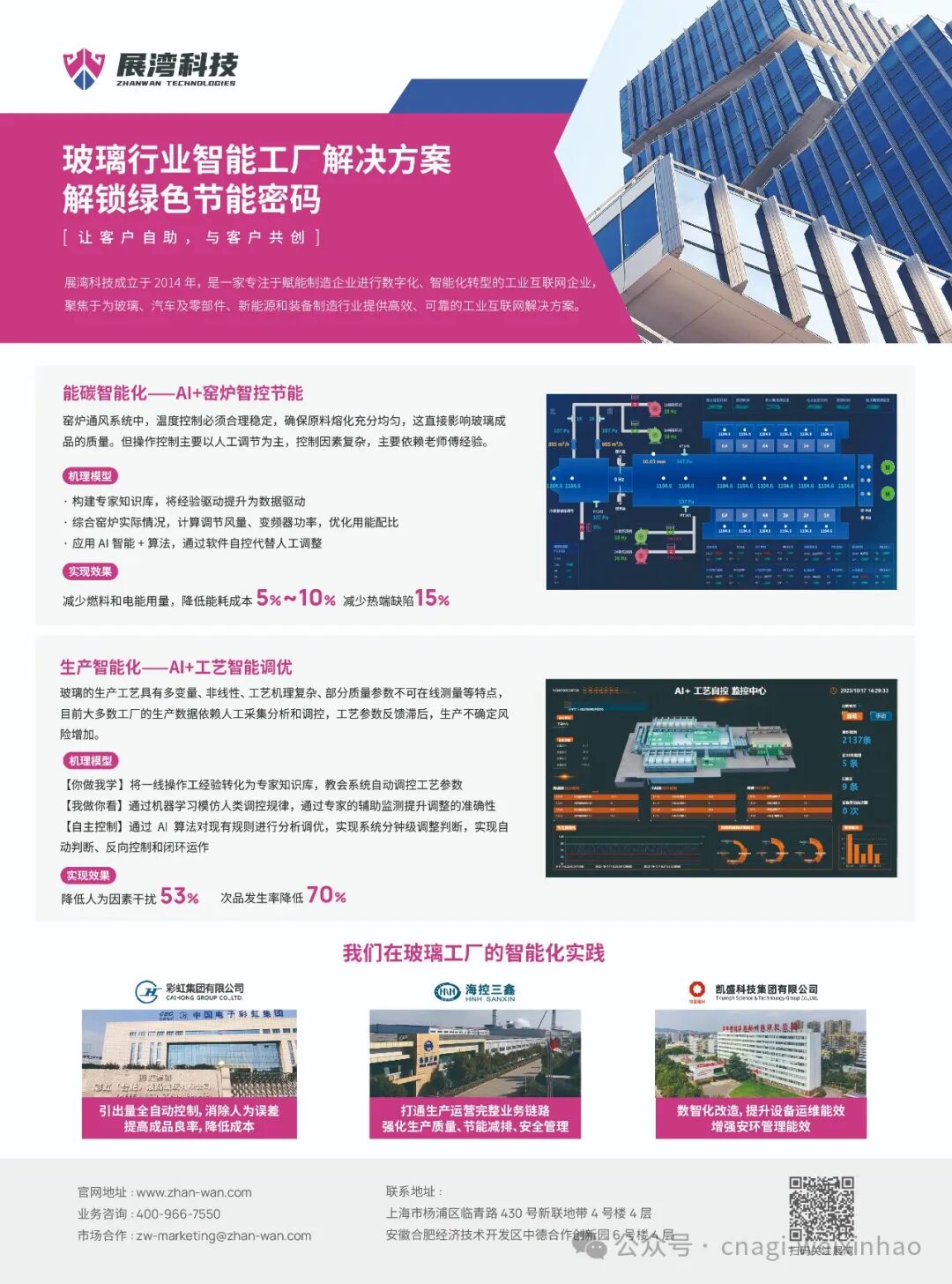 上海展湾信息科技有限公司成立于2014年,作为一家专注于工业互联网与AI大模型融合的高科技企业,致力于为玻璃制造企业提供前沿、高效的数智化与自动化结合的创新型解决方案。展湾科技自主研发的【糖炒板栗】工业大模型,将前沿AI大模型技术结合工业自动化控制技术落地于传统工业场景,已经在日用玻璃、显示玻璃、浮法玻璃、光伏玻璃、药用玻璃等领域实践应用,覆盖热端、冷端、深加工、公辅等核心工艺流程,优化和沉淀工艺“老师傅”的经验,助力企业提质增效、节能减碳。展湾科技凭借出色的技术实力与创新能力,在行业内赢得了广泛认可。入选工信部2023年工业互联网试点示范名单和2023年新一代信息技术典型产品、应用和服务案例名单;连续两年入选安徽省制造业数字化转型服务商名单;同时也是合肥市、杭州市、天津滨海新区、龙岩市等多地工业数字化服务商及中小企业数字化转型城市试点服务商。展湾科技总部位于上海市杨浦区核心地段,是上海市高新技术企业,并在安徽合肥经开区、天津滨海新区、重庆渝北区设立有独立法人的子公司。
