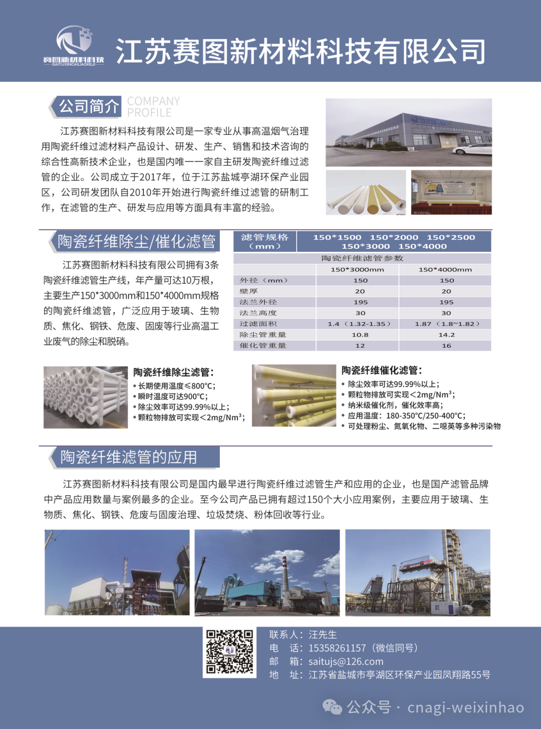 江苏赛图新材料科技有限公司是一家专业从事高温烟气超低排放治理,用陶瓷纤维过滤材料产品设计、研发、生产、销售和技术咨询的综合性企业,公司研发团队从2010年开始从事陶瓷纤维过滤材料的研制工作,自主研发的陶瓷纤维过滤管是可耐高温、实现 PM、SO2、NOX和二噁英等烟气综合污染物超低排放标准的过滤材料。 目前,公司建有3条全自主研发的陶瓷纤维过滤管生产线,年生产能力达到10万支,自成立以来先后共获得授权专利共35项,其中发明7项,实用新型28项。2021年成功通过国家高企认证。2022年荣获盐城市工程技术研究中心称号。我公司愿与所有从事大气治理环保领域的所有企业、科研单位、设计院等进行通力合作,共同致力于废气治理技术与材料的综合发展。