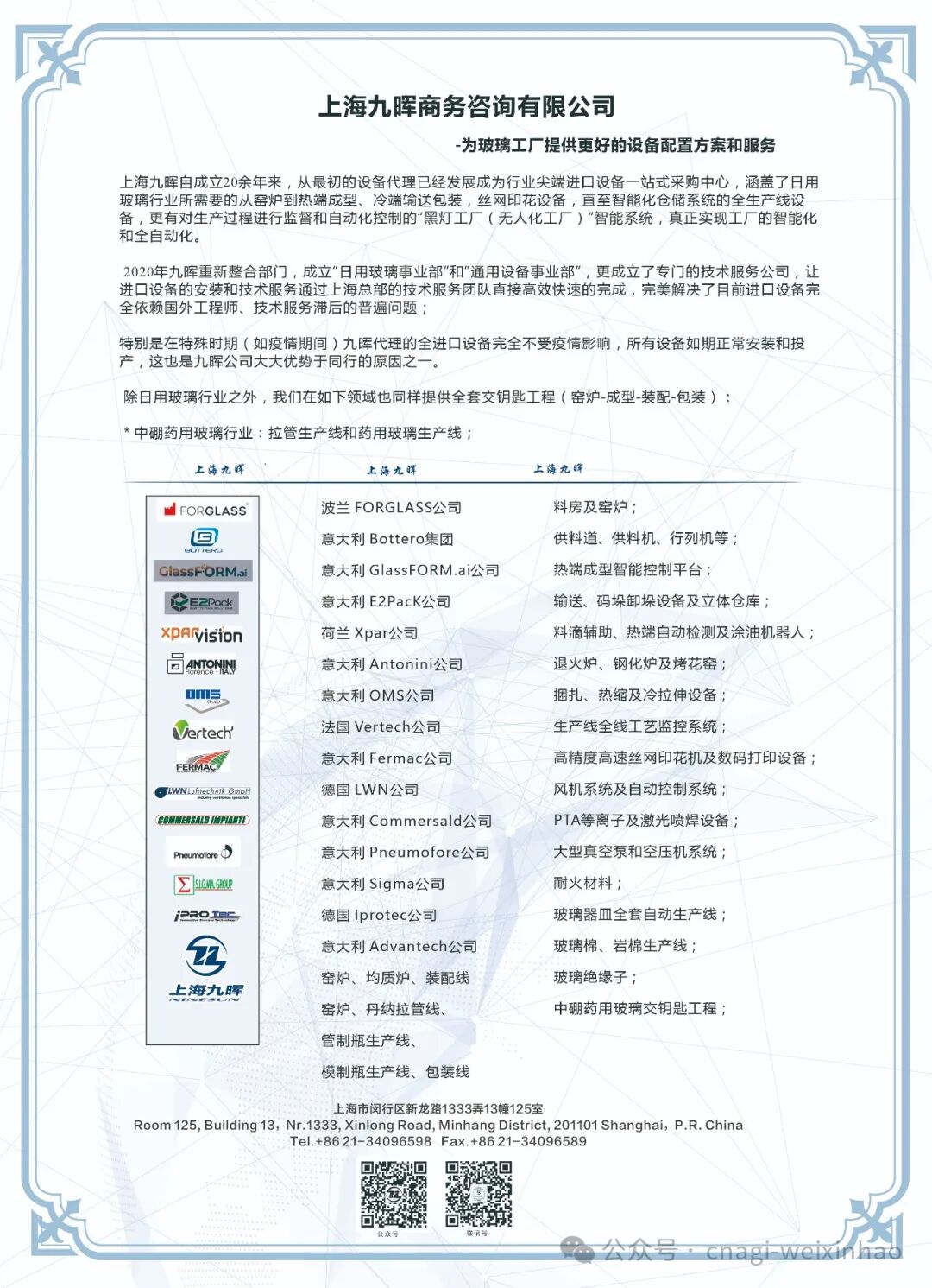 上海九晖商务咨询有限公司,为玻璃工厂提供更好的一站式设备配置方案和服务。上海九晖自成立20余年来,从最初的设备代理已经发展成为行业尖端进口设备一站式采购中心,涵盖了日用玻璃行业所需要的从窑炉到热端成型、冷端输送包装,丝网印花设备,直至智能化仓储系统的全生产线设备,更有对生产过程进行监督和自动化控制的“黑灯工厂(无人化工厂)”智能系统,真正实现工厂的智能化和全自动化。2020年九晖重新整合部门,成立“日用玻璃事业部”和“通用设备事业部”,更成立了专门的技术服务公司,让进口设备的安装和技术服务通过上海总部的技术服务团队直接高效快速的完成,完美解决了目前进口设备完全依赖国外工程师、技术服务滞后的普遍问题。特别是在特殊时期(如疫情期间)九晖代理的全进口设备完全不受疫情影响,所有设备如期正常安装和投产,这也是九晖公司大大优势于同行的原因之一。除日用玻璃行业之外,我们在中硼药用玻璃行业(拉管生产线和药用玻璃生产线)提供全套交钥匙工程(窑炉-成型-装配-包装)。邮箱:celinejiang@nsjiuhui.com