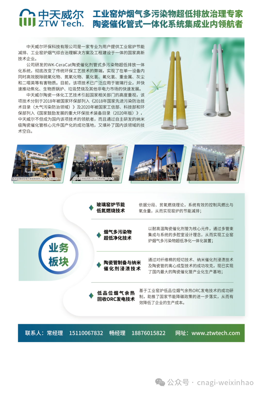 中天威尔环保科技有限公司成立于2015年,公司主要致力于工业窑炉节能减排及烟气净化技术的研发与市场推广,是一家专业为用户提供源头工业窑炉节能减排、末端烟气多污染物超低净化、低品位烟气余热高效利用及系统工程建设于一体的国家高新技术企业。公司经营主要包括三方面业务:一、节能减排一工业窑炉节能降碳技术、低氮燃烧技术与低品位烟气余热回收ORC发电技术;二、烟气净化一工业窑炉烟气多污染物超低净化技术与系统数智化大数据管理平台;三、产业基地一陶瓷纤维滤管制备技术与纳米钒钛催化剂浸渍技术。“威尔人”以低碳绿色科技创新为公司发展理念,并主动融入国家“双碳”战略和绿色发展大局。不但推动玻璃企业绿色低碳的快速转型,而且助力了玻璃企业高质量发展,其宗旨服务于碳达峰碳中和,并为玻璃企业赋能增效。