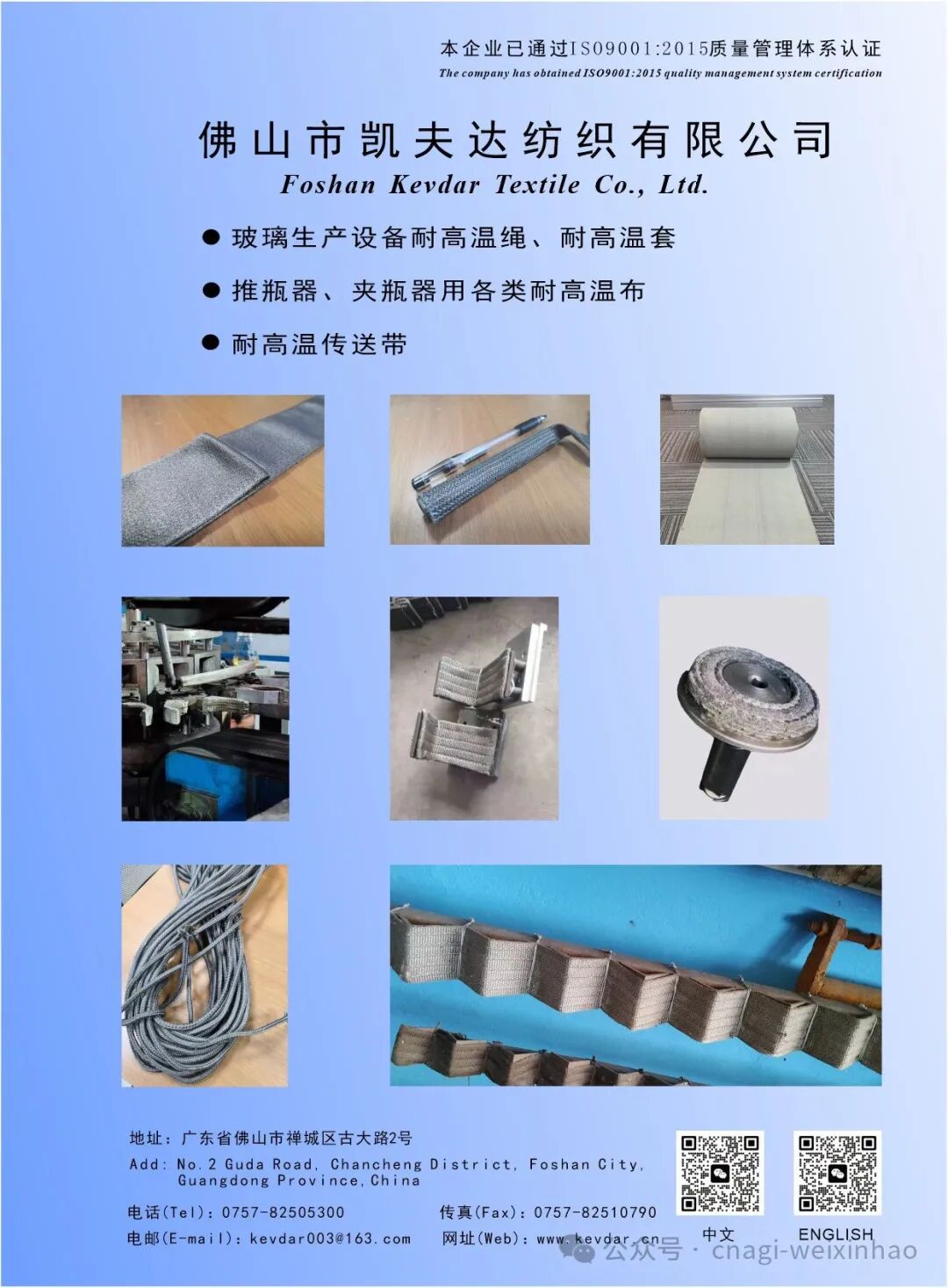 佛山市凯夫达纺织有限公司成立于2011年,位于国家纺织重镇——广东佛山。主要设计生产各种耐高温、耐磨新材料纺织品,产品主要用于日用玻璃、汽车玻璃生产过程中的产品隔热缓冲和保护。凯夫达公司新开发的耐温800度的金属绳、金属带等产品,目前广泛应用于日用玻璃行业,相比较传统的金属纤维产品,具有使用寿命长、经济、节能等特点,金属纤维毛毡及高温输送带等产品目前远销国内外。凯夫达公司自主研发的专利产品:陶瓷辊不锈钢纤维编织套,可解决玻璃钢化过程中产生的麻点、划痕、亮带等质量问题,目前广泛应用于汽车玻璃、家电玻璃、电子玻璃、建筑玻璃等行业。企业通过了ISO9001国际质量管理体系认证,产品长期为国内各大玻璃厂和设备厂选购配套使用。电话:0757-82505300 18942406790
