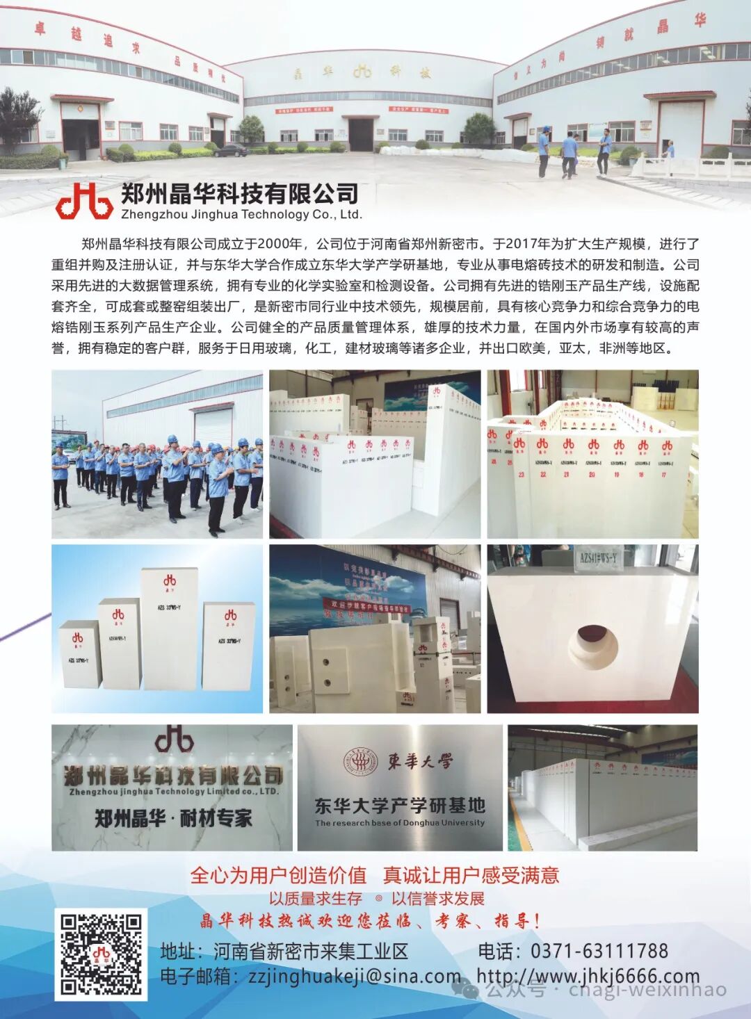 郑州晶华科技有限公司成立于2000年,于2017年为扩大生产规模,进行了重组并购及注册认证,位于河南省郑州市新密市,地处中原腹地,交通便利。公司现有在职员工100余人,专业工程技术人员10人,3500千瓦电弧炉1台,自动除尘设备2台,切、磨设备12台,1000平方米组装平台;专业的化学实验室,检测试备齐全,并与上海市东华大学合作成立产学研基地。公司硬件高端,质量优良,模具制作熔铸生产、切割磨洗钻孔挖槽、大型组装设备、设施配套齐全,可成套或整窑组装出厂,是新密市同行业中技术领先、规模居前、最具有核心竞争力和综合竞争力的电熔锆刚玉系列产品生产企业。公司专业从事玻璃窑用熔铸锆刚玉耐火材料的生产制造。公司健全的产品质量管理体系,雄厚的技术力量,在国内外市场享有较高的声誉,拥有稳定的客户群,服务于日用玻璃,建材玻璃等诸多企业,并出口欧美、亚太、非洲等地区。近几年来,公司始终坚持:以客户需求为营销导向,以科技投入为发展动力,以产品质量为生存基础,以确保信誉拓宽占领市场的经营原则。通过多年来不断努力,在社会上树立了良好的企业形象。公司主要产品有:熔铸锆刚玉AZS33#、AZS36#、AZS41#、各类特殊用途耐火材料、成型砖、锆质捣打料、浇铸料等。广泛应用于玻璃、石化、冶金、建材等行业。拥有蓄热室用筒子砖、旋转管、勺料筒、料棒、坩埚等特色产品。企业目标:天道酬勤,效为人先,与时俱进,勇争业强。企业理念:专注 提升,以人为本,专业制作,认真,细致的为客户提供产品和服务。电子邮箱:zzjinghuakeji@sina.com